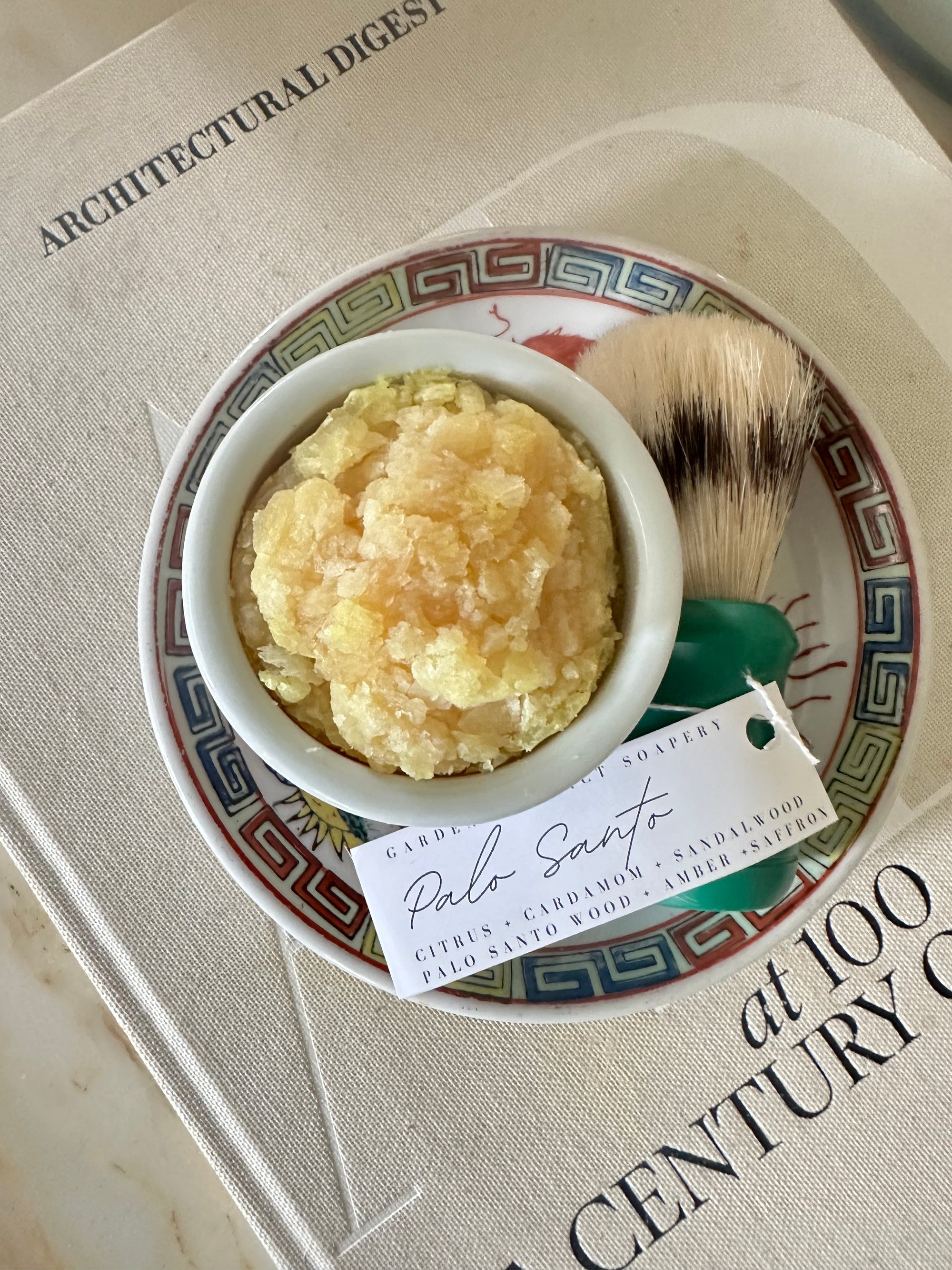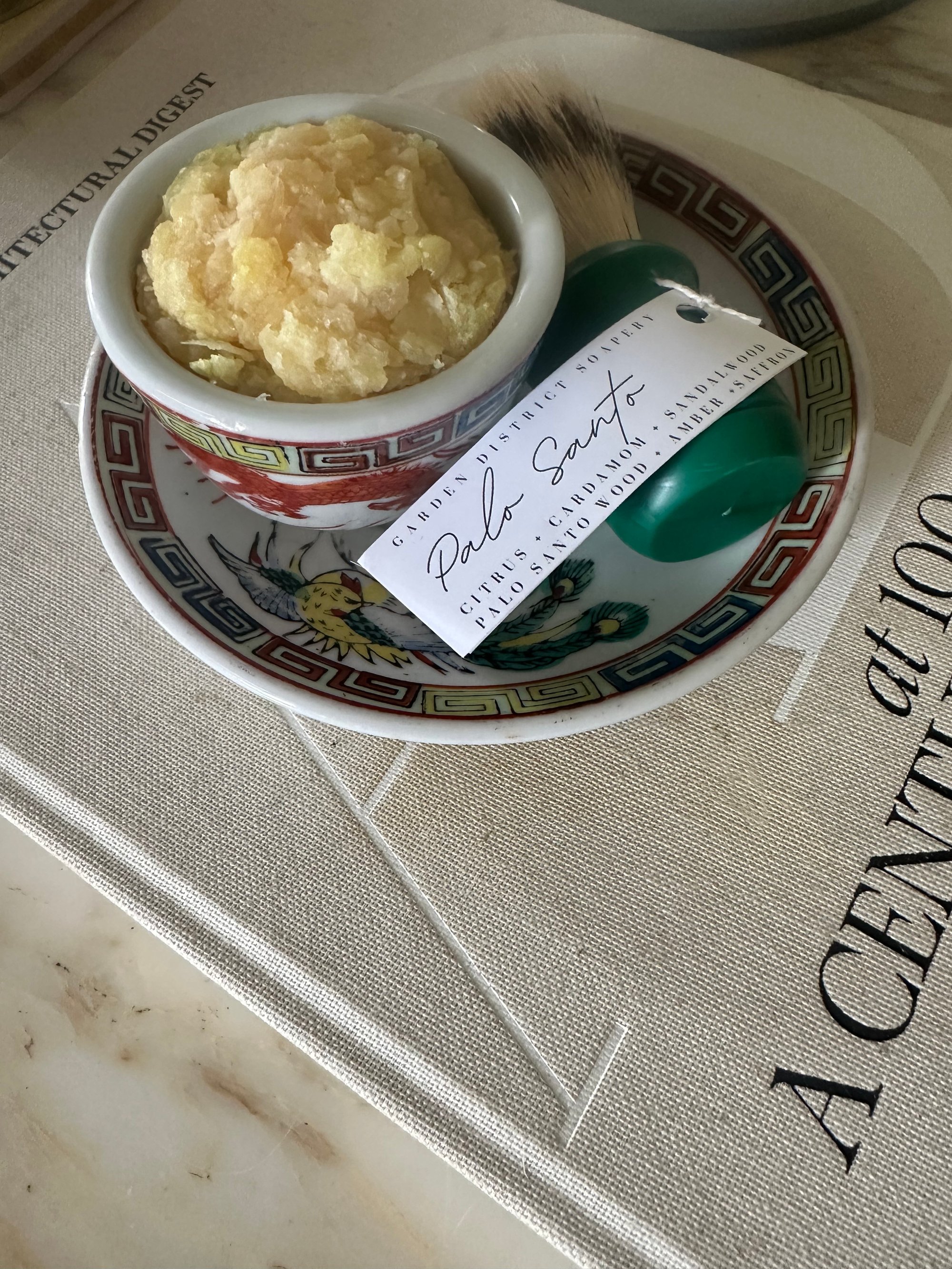 1. Prep: Your face is best prepped for shaving using hot water. Your brush placed in a cup of warm water for 3 minutes. Your soap to be covered in warm water just over the top of the soap for 3 minutes.