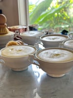 Includes Long Handled Bamboo Brush with Natural Bristles, and 1 Pound in white porcelain double handled and footed bouillon bowl. Comes with round Wooden Horse Hair Brush.
